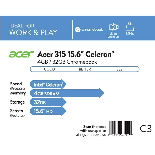 Tags: 15.6 Inch, 32gb ssd, 4gb ram, acer, cb315-3h-c2c3, celeron n4000, chromebook