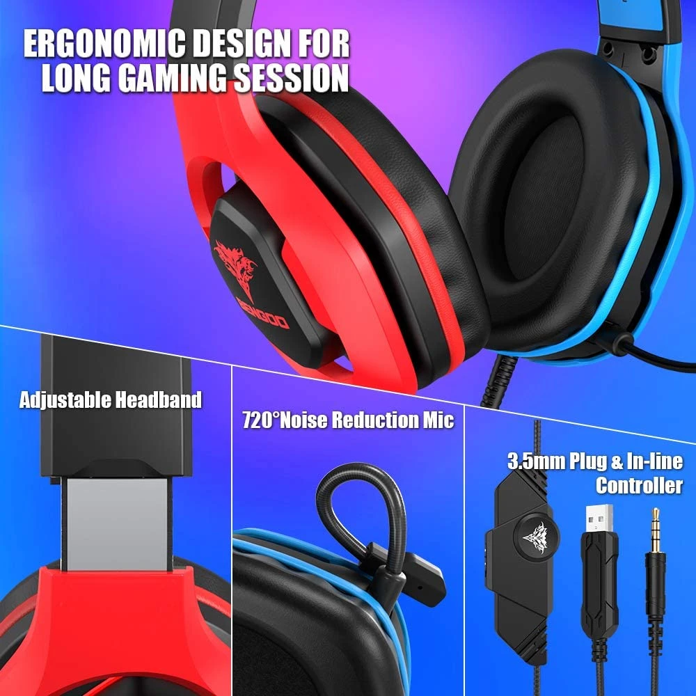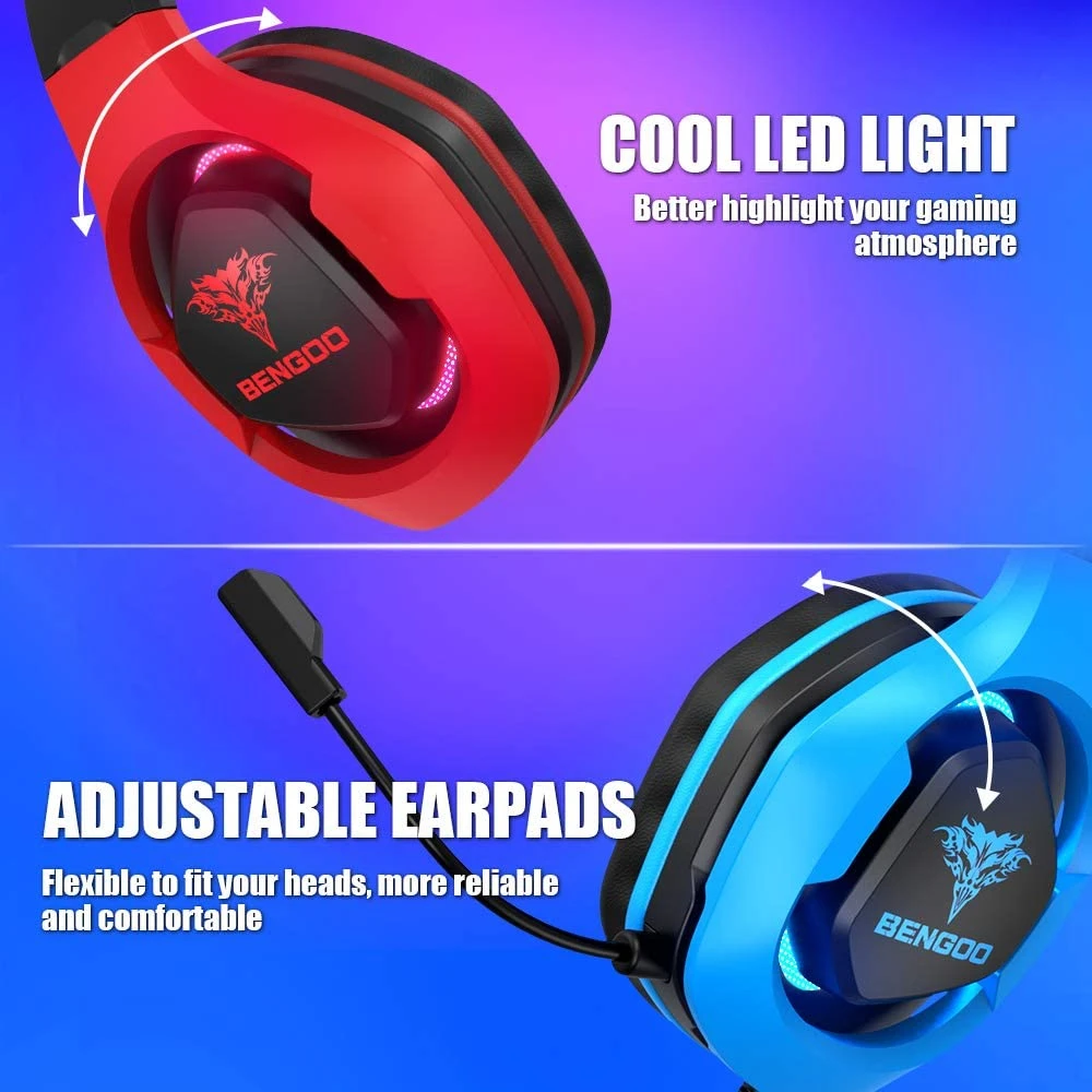 - RED AND BLUE BICOLOR FEATURE – Advanced and unique design. Different from the traditional headset, we taking red and blue bicolor to the headset, and meanwhile, it got the red and blue light effects, delivers you a more exciting gaming experience, extremely highlight your gaming atmosphere.