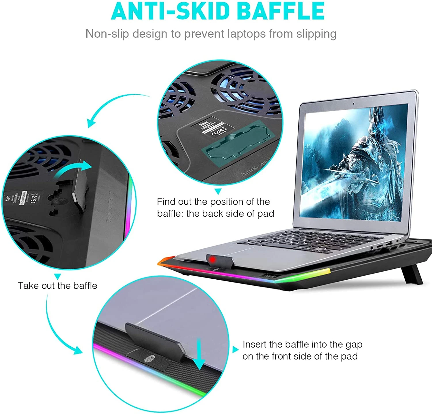 - RGB Laptop Cooling Pad – Cooling pad with 15 kinds of RGB side light, one button to switch,creates a cool atmosphere,perfect for gaming and working.
