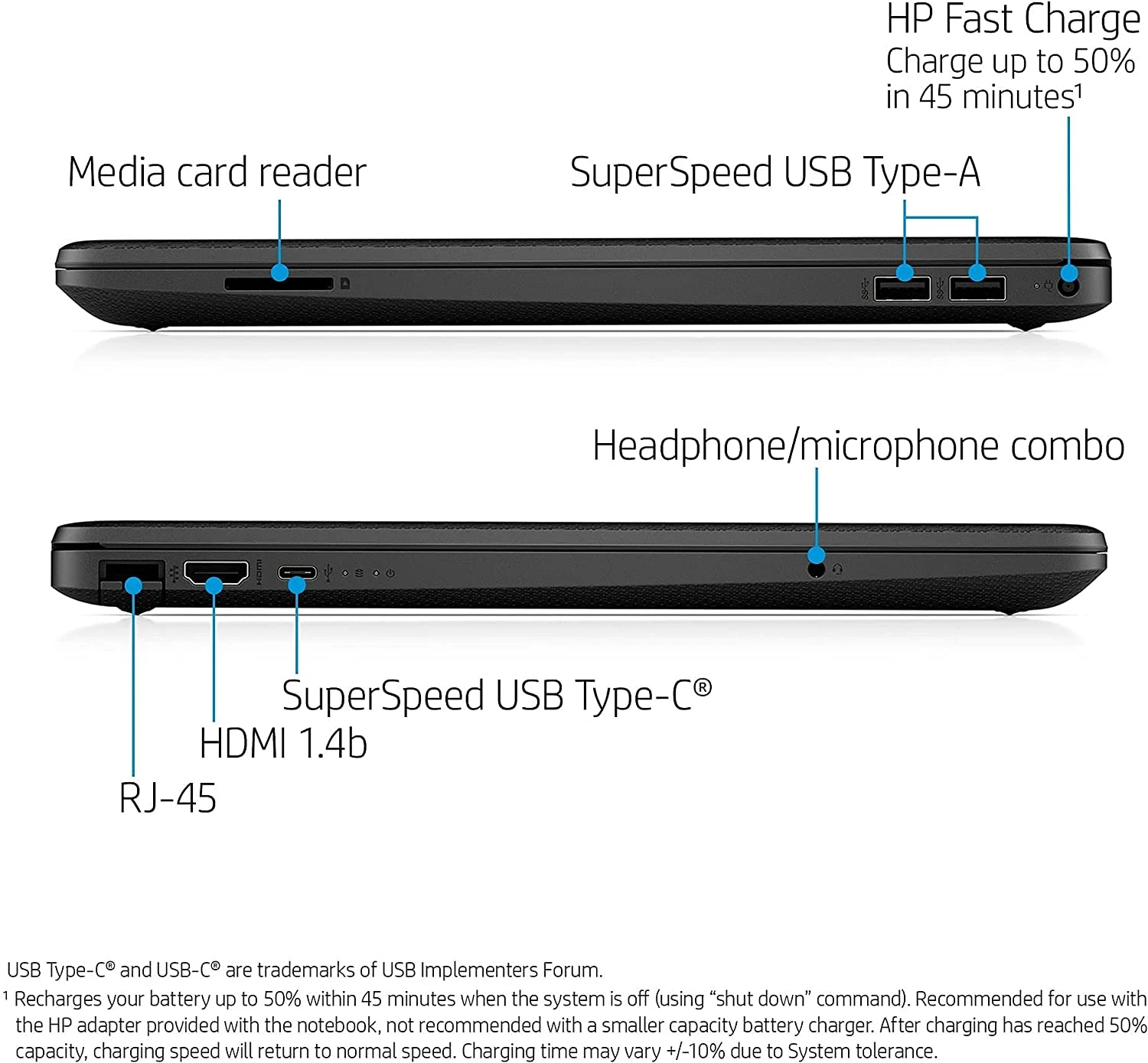 - Tech Specs – 1 x SuperSpeed USB Type-C 5Gbps signaling rate | 2 x SuperSpeed USB Type-A 5Gbps signaling rate | 1 x HDMI 1.4b | 1 x RJ-45 | 1 x AC smart pin | 1 x headphone/microphone combo | 1 x multi-format SD media card reader | Webcam | Wi-Fi | Bluetooth | Windows 11 Home 64 bit