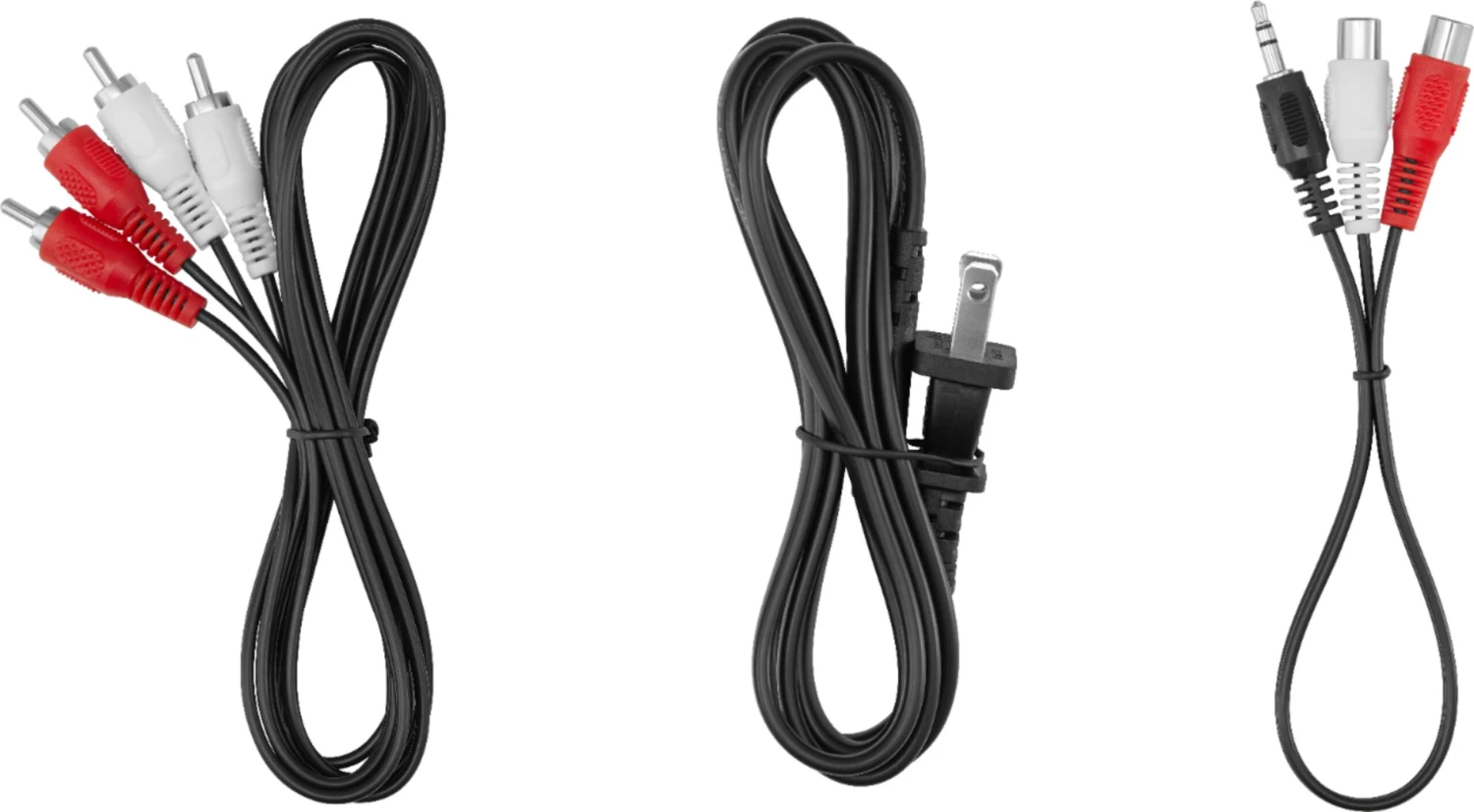 Remote control, 2 AAA batteries, RCA to 3.5 mm adapter, wall template, RCA cable
