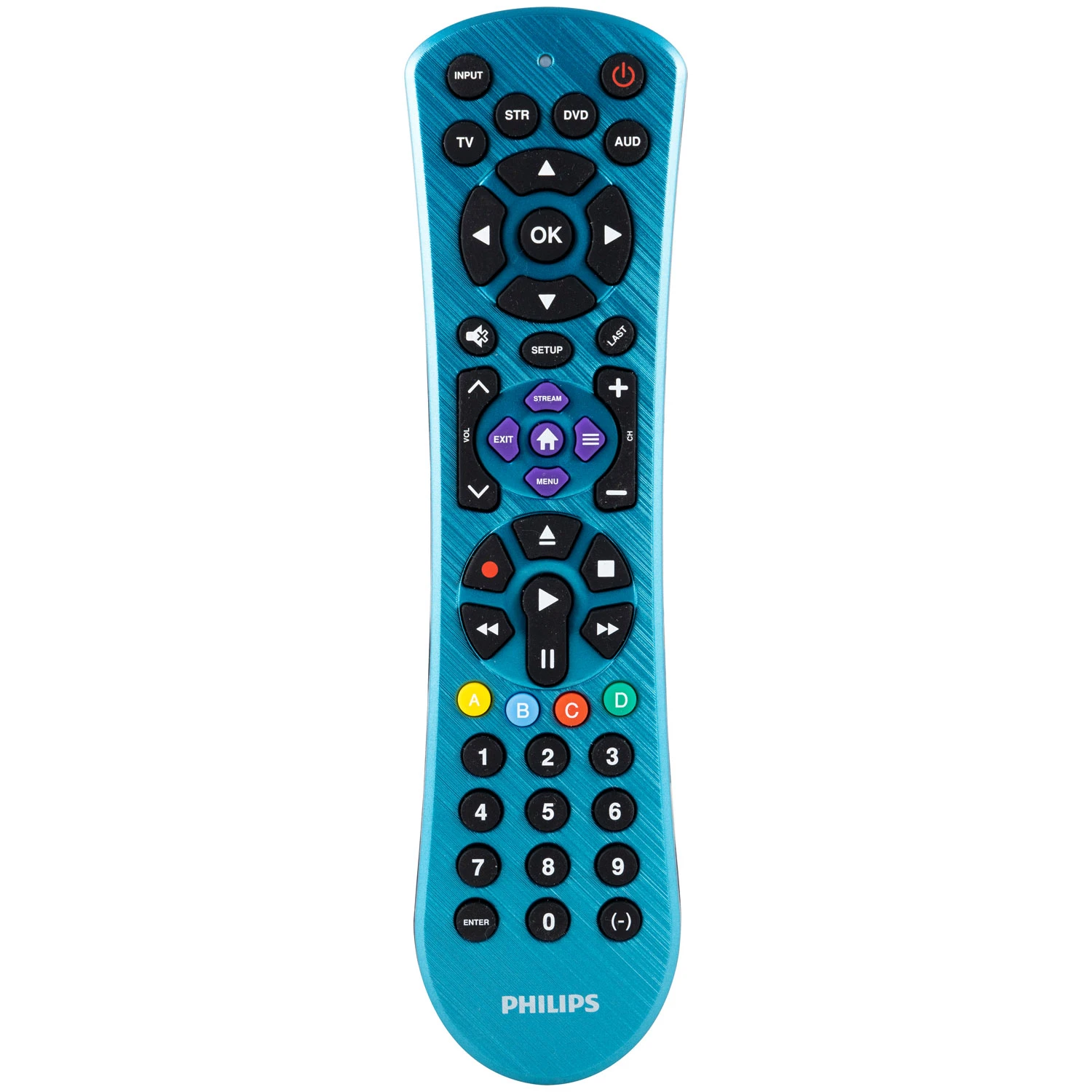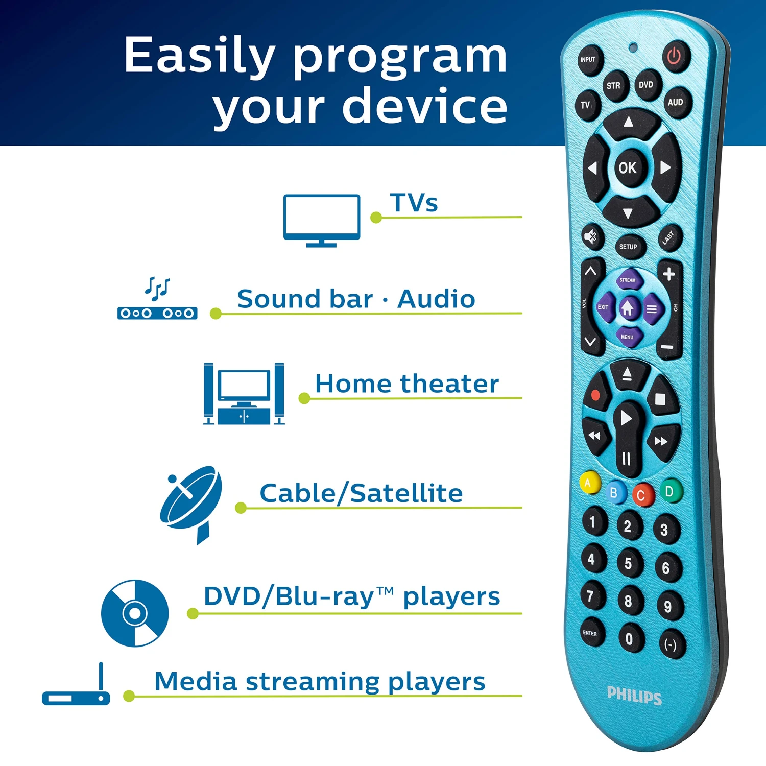 Add a touch of shimmer to your home theater setup with the Philips 4-Device Universal Remote in an elegant electric blue finish. Designed to operate four separate devices, including your TV, Blu-ray player, cable, satellite and more, this universal remote lets you consolidate your controllers into one handheld device. Eliminate the hassle of managing multiple remotes as you enhance and simplify your home entertainment system. This remote is preprogrammed for immediate use with Samsung TVs and Roku boxes, and offers simple, user friendly setup with your choice of auto code search or direct code entry. The primary audio control feature allows you to adjust the volume regardless of which device is being used. And, for added convenience, this remote includes a Blu-ray/DVD player open/close button as well as advanced DVR functions, simple menu navigation, a dash button for sub-channel access and a streaming button to take you straight to media platforms. Make this Philips 4-Device Universal remote the center of your home entertainment system.