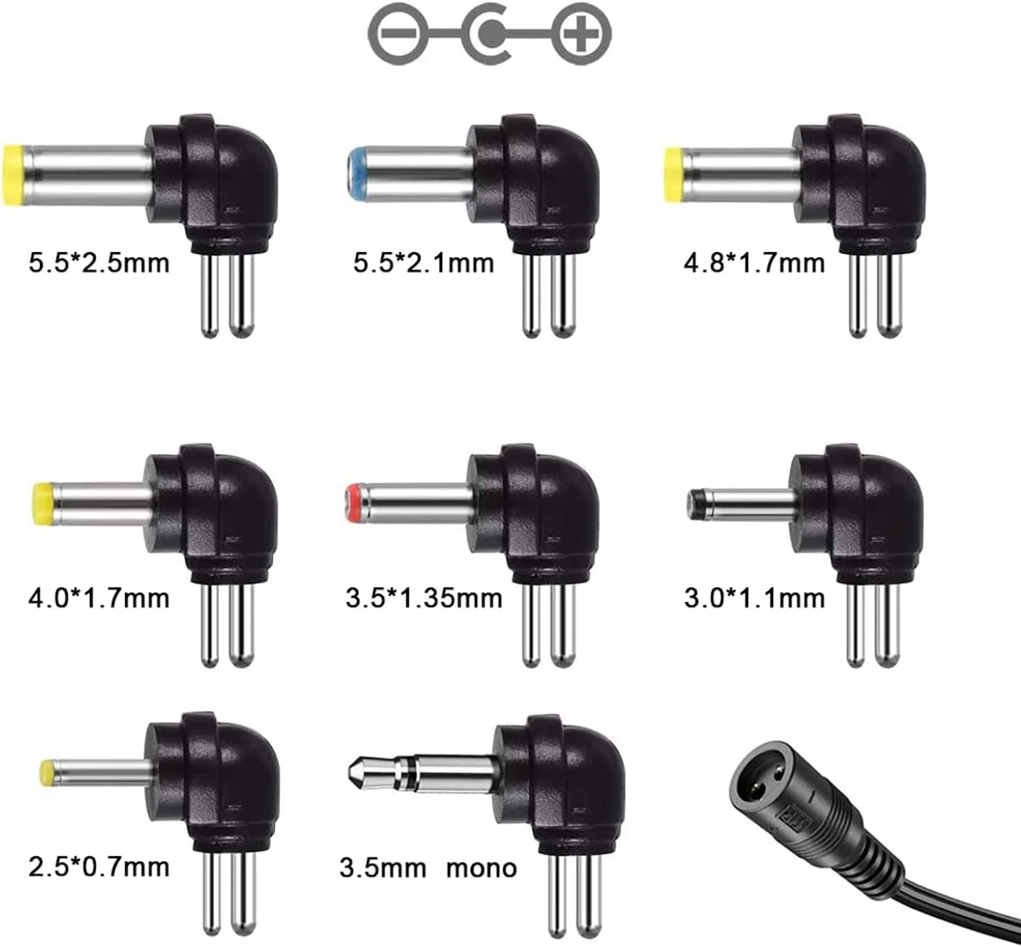- Multiple DC Tips – A set of popular dimension dc connectors. Works with lots of consumer electronics, such as router, led strips, lamp, webcams, security cameras, HDMI switchers, GPS, kids toys, usb hub, tablets, electronic gizmos, DIY circuits and more